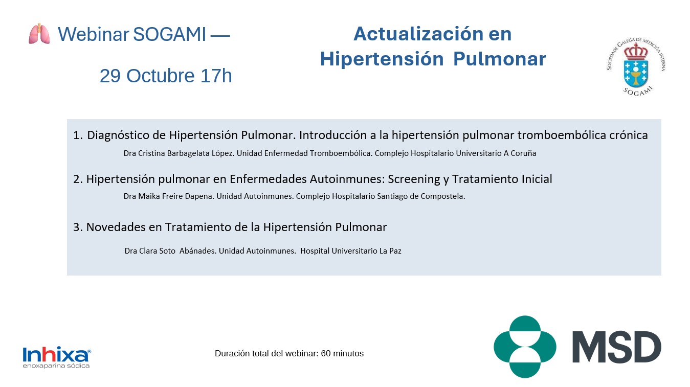 Desde la SOGAMI tenemos el placer de invitarte a la Webinar: Actualización en Hipertensión Pulmonar que tendrá lugar el próximo 29 de Octubre a las 17h con una duración de 60 minutos.
