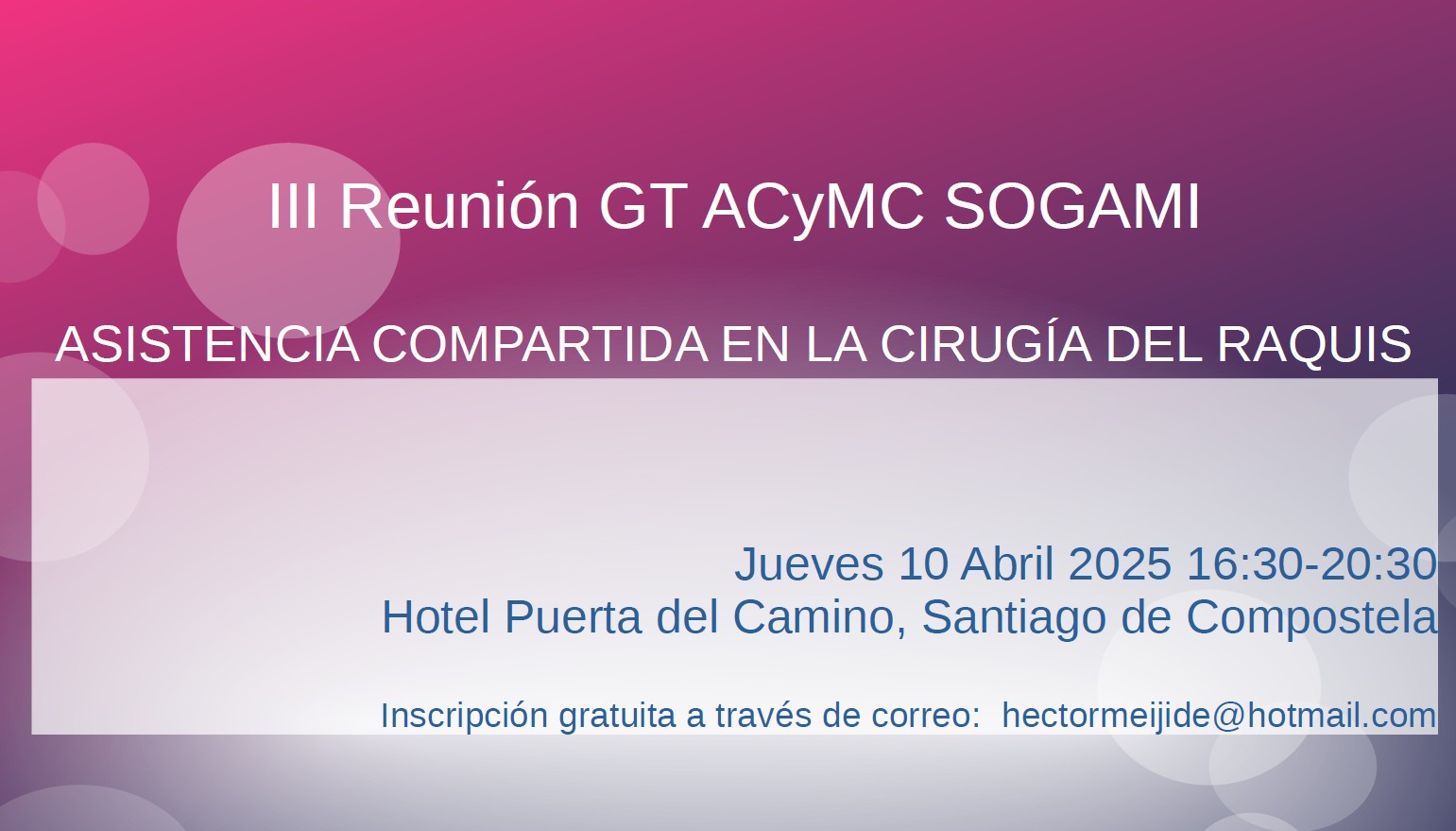InicioActividades y videosIII Reunión GT ACyMC SOGAMI - ASISTENCIA COMPARTIDA EN LA CIRUGÍA DEL... III Reunión GT ACyMC SOGAMI – ASISTENCIA COMPARTIDA EN LA CIRUGÍA DEL RAQUIS Descargar Programa Reunión